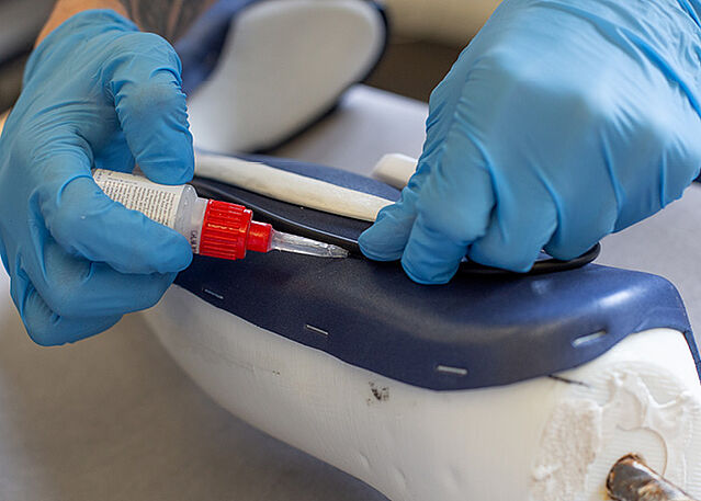 Rimuovere la stringa modulare. Se il modello è ancora umido, isolarlo prima con film di compressione. Successivamente infilare una calza di rinforzo in PA e un rotolo di film in PVA sul modello. La dima per colata per l’unità di comando e il cavo di collegamento si trovano sotto al rotolo di film in PVA e formano parte del modello.